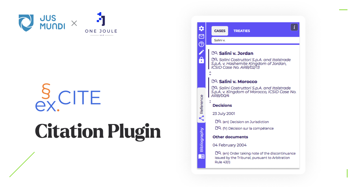 As their first joint move, the two companies interconnect their flagship products: One Joule’s ex.CITE and Jus Mundi’s database of international law and arbitration. ex.CITE is a Word plugin that automates legal citation in international dispute resolution pleadings and publications. ex.CITE is now conveniently linked to Jus Mundi, the world’s most comprehensive database of international law and arbitration sources.